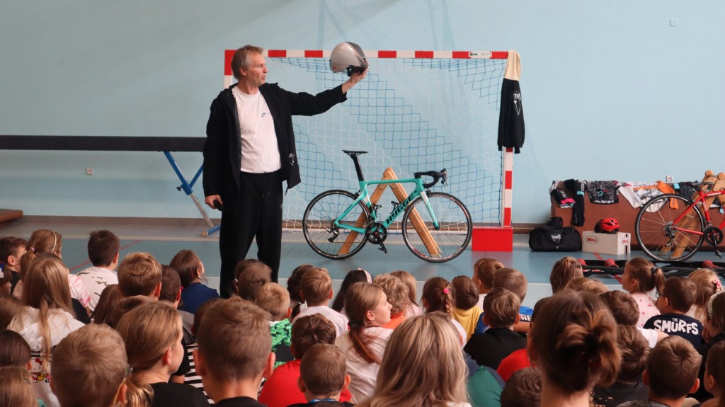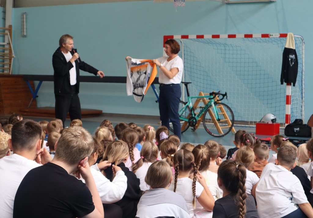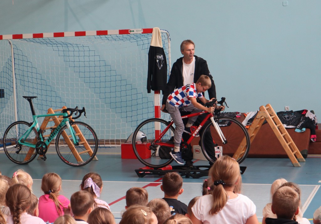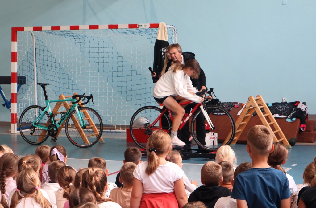 Niespodzianką dla uczniów w środę była wizyta Dariusza Skupnia, pierwszego trenera Eugenii Bujak, mistrzyni Europy na torze i mistrzyni Polski w kolarstwie szosowym, który przedstawił uczniom tą mało znaną przez nich dyscyplinę.