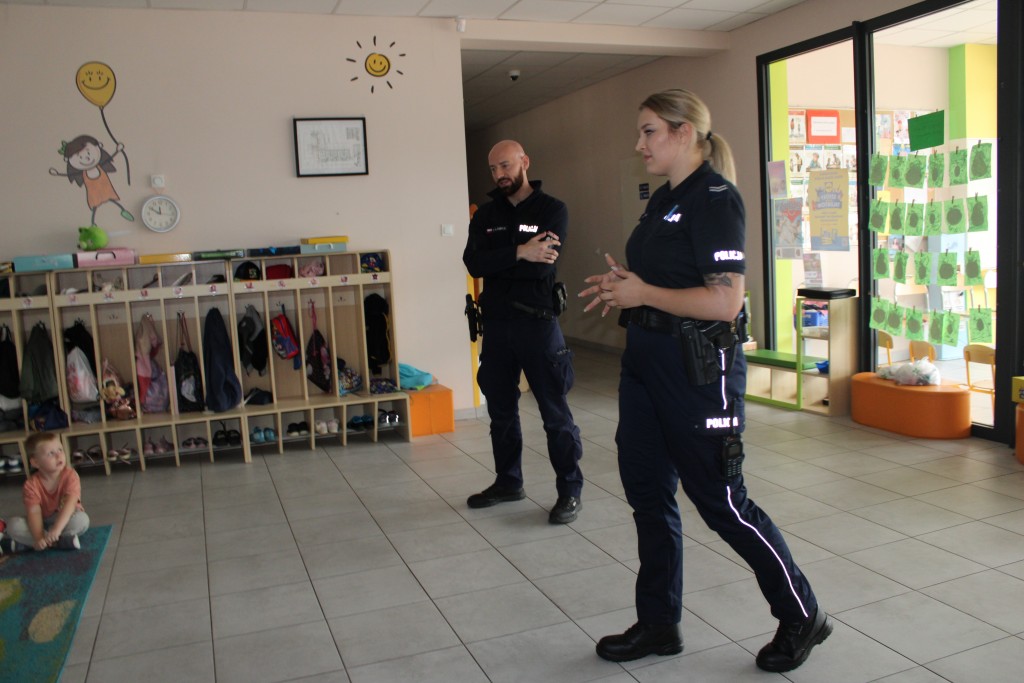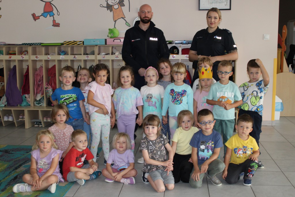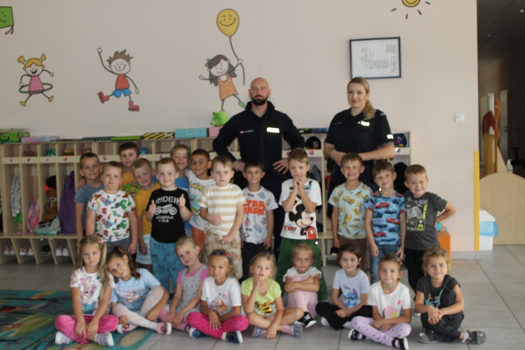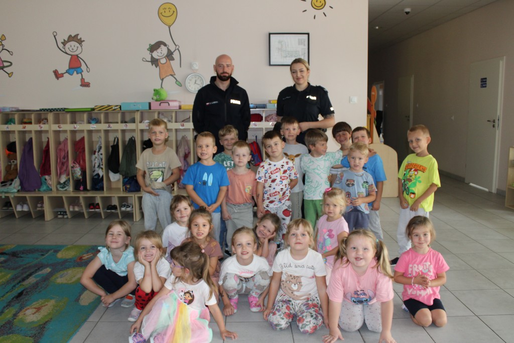 22 września b.r. do przedszkola przyjechali policjanci. Celem ich wizyty było przypomnienie najmłodszym najważniejszych zasad bezpieczeństwa na drodze. Policjanci w bardzo przystępny i ciekawy sposób opowiadali dzieciom o tym, jak prawidłowo przechodzić przez jezdnię, jak ważne jest noszenie odblasków oraz dlaczego należy zawsze zachowywać ostrożność w pobliżu ulicy. Przedszkolaki miały także okazję zadać pytania oraz pochwalić się swoją wiedzą na temat znaków drogowych i sygnalizacji świetlnej.