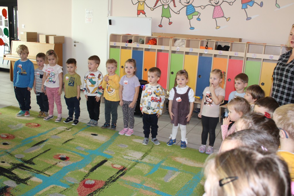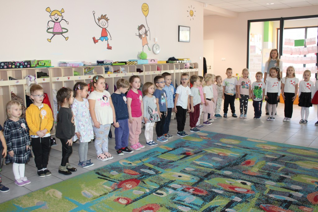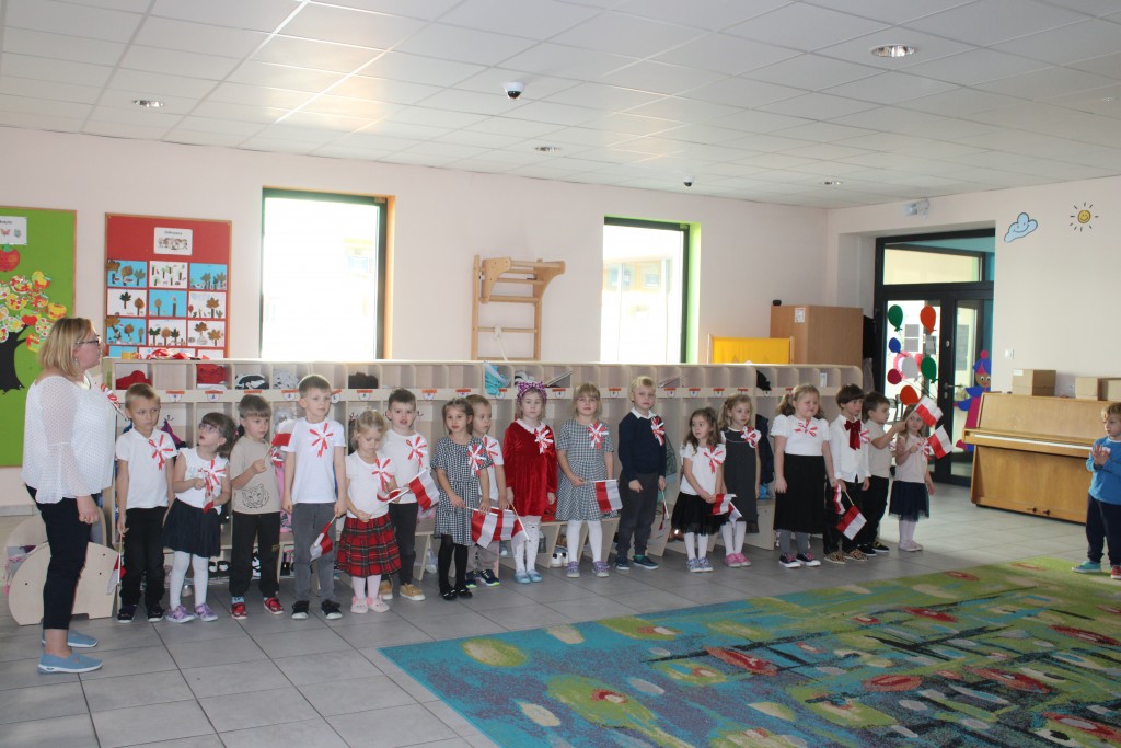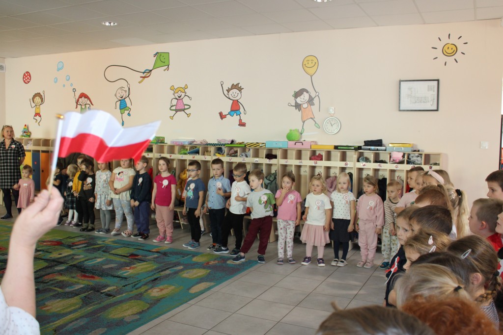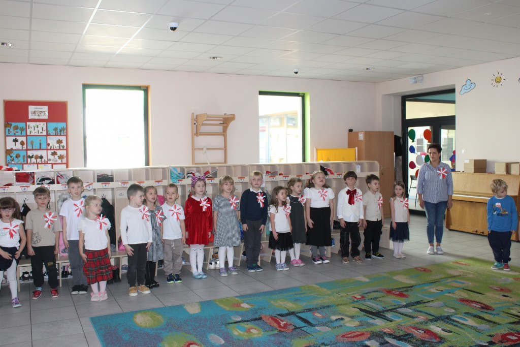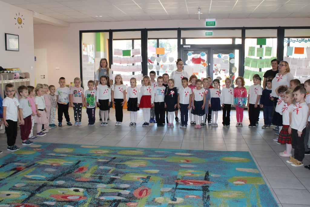 O godzinie 11:11 wszystkie grupy zebrały się w szatni. Przedszkolaki, ubrane w barwy narodowe lub ozdobione własnoręcznie wykonanymi kotylionami, odśpiewały uroczyście „Mazurka Dąbrowskiego”. Dzieci śpiewały z dużym zaangażowaniem i powagą, a cała uroczystość przebiegła w podniosłej atmosferze.