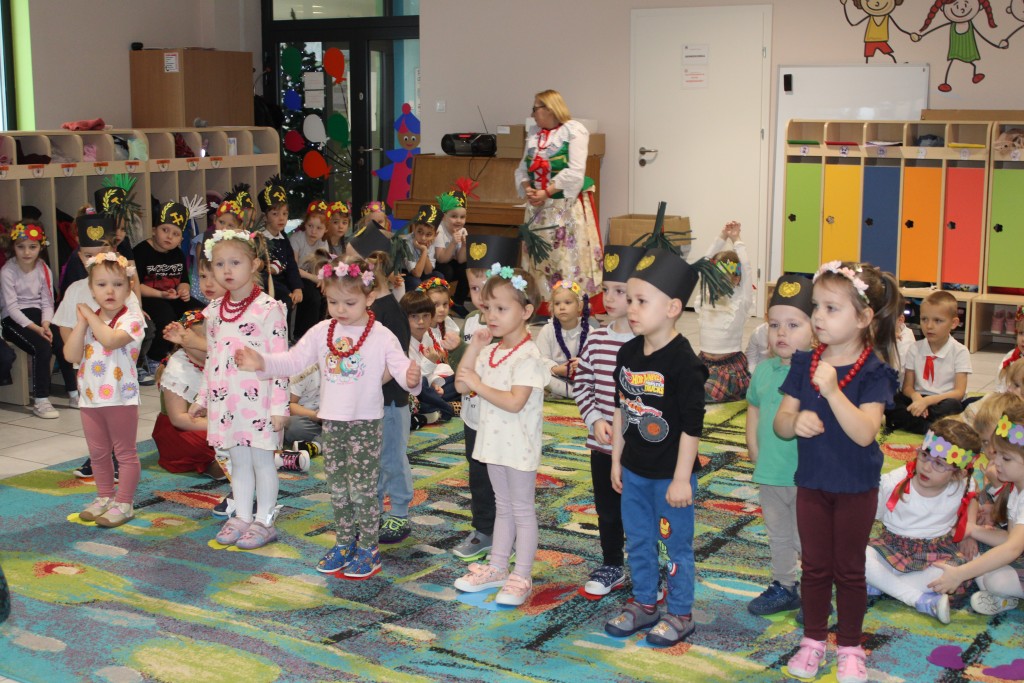 Pierwszy Dzień Wiosny w naszym przedszkolu był pełen radości, kolorów i niesamowitej atmosfery! Wszystko rozpoczęło się od uroczystego przedstawienia wiosennego, które dzieci z wszystkich grup przygotowały pod okiem wychowawców. Na scenie pojawiły się postacie symbolizujące wiosnę – motyle, biedronki, żabka, pszczółki. Dzieci śpiewały radosne piosenki o budzącej się przyrodzie, a także recytowały wiersze, które opowiadały o zmianach, jakie zachodzą na wiosnę. Po przedstawieniu nadszedł moment, na który dzieci czekały z niecierpliwością – pożegnanie Marzanny. Pierwszy Dzień Wiosny w naszym przedszkolu to wydarzenie, które na długo pozostanie w pamięci dzieci.
