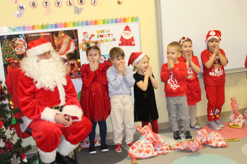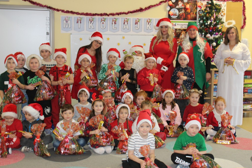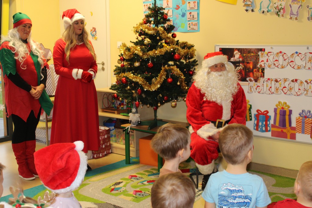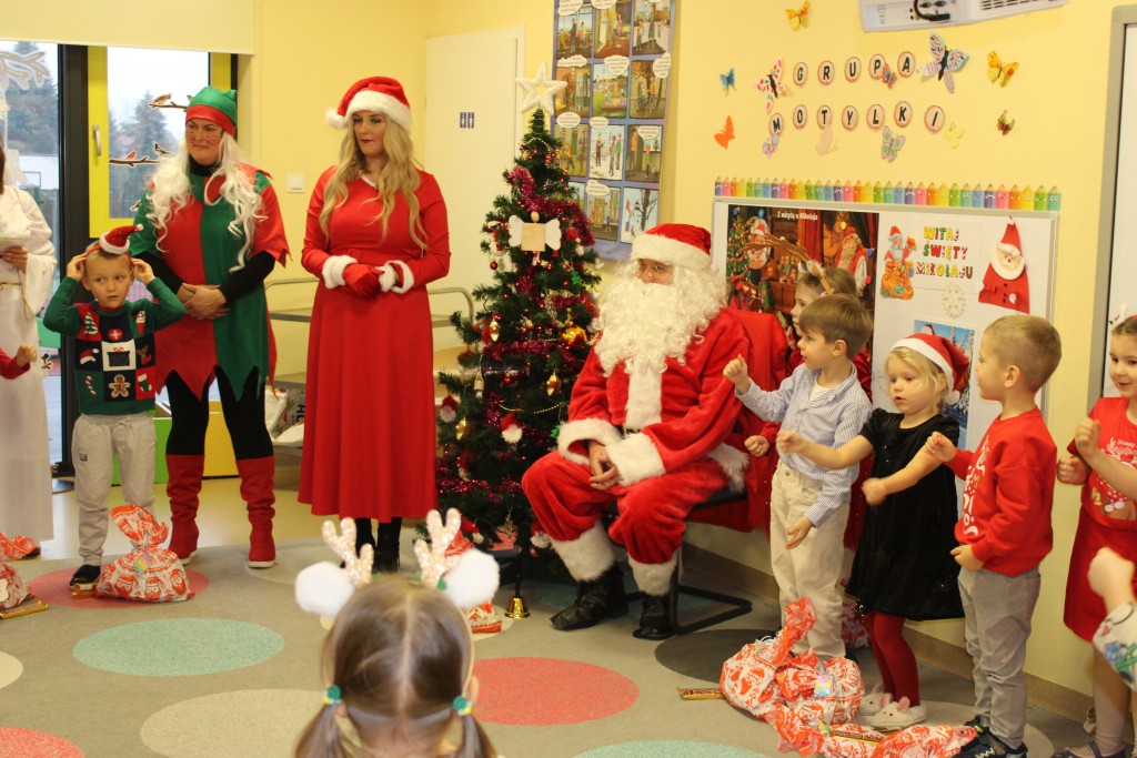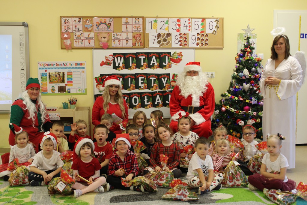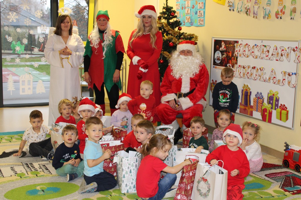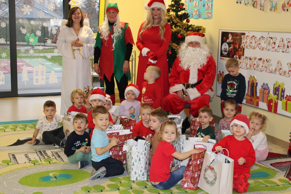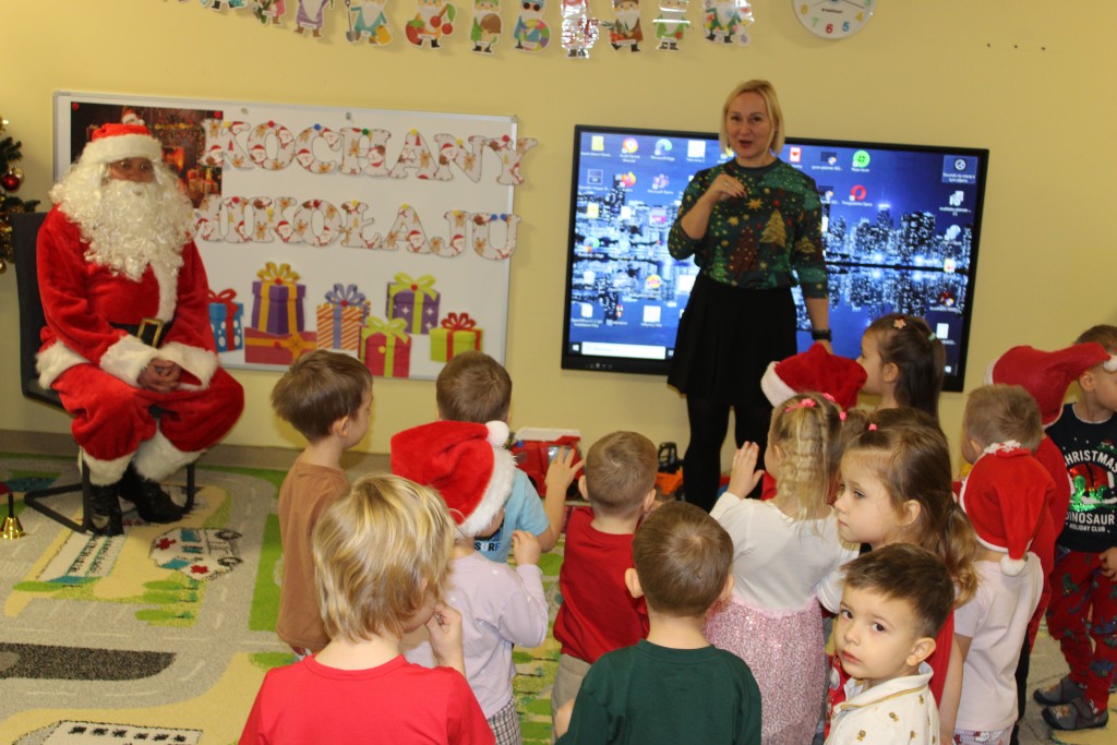 5 grudnia w naszym przedszkolu panowała wyjątkowa, pełna radości atmosfera. Już od rana dzieci z niecierpliwością nasłuchiwały dźwięku dzwoneczków, które mogły zwiastować nadejście długo wyczekiwanego gościa. Gdy wreszcie w drzwiach pojawił się Święty Mikołaj, w towarzystwie swoich pomocników, na twarzach przedszkolaków pojawiły się szerokie uśmiechy i iskierki zachwytu.Najbardziej wyczekiwanym momentem było oczywiście wręczanie prezentów. Każde dziecko zostało wywołane po imieniu i otrzymało paczkę od Świętego Mikołaja, który nie szczędził miłych słów, pochwał i zachęt do dalszego rozwijania swoich talentów. Pomocnicy czuwali nad tym, aby każdy otrzymał upominek i mógł zrobić sobie pamiątkowe zdjęcie z wyjątkowym gościem. Na zakończenie spotkania dzieci podziękowały Mikołajowi za wizytę, wręczając własnoręcznie przygotowane laurki. W przedszkolu jeszcze długo rozbrzmiewały świąteczne melodie.