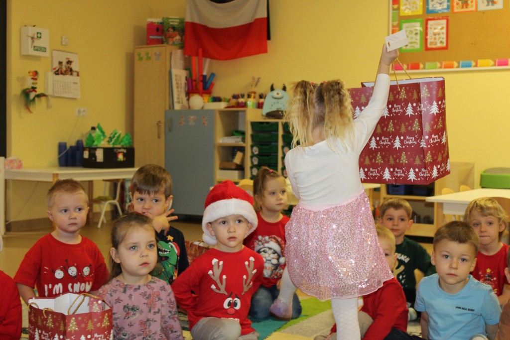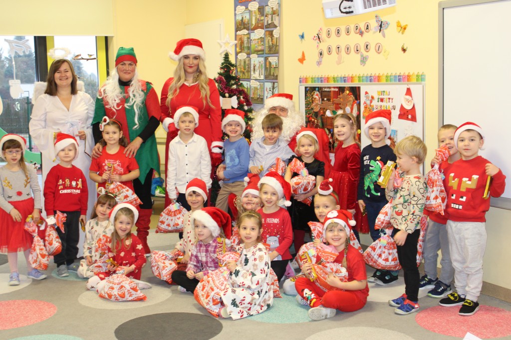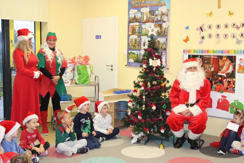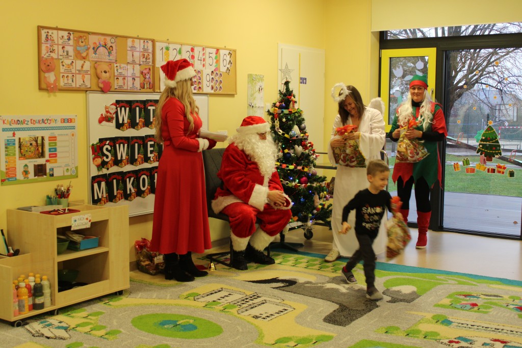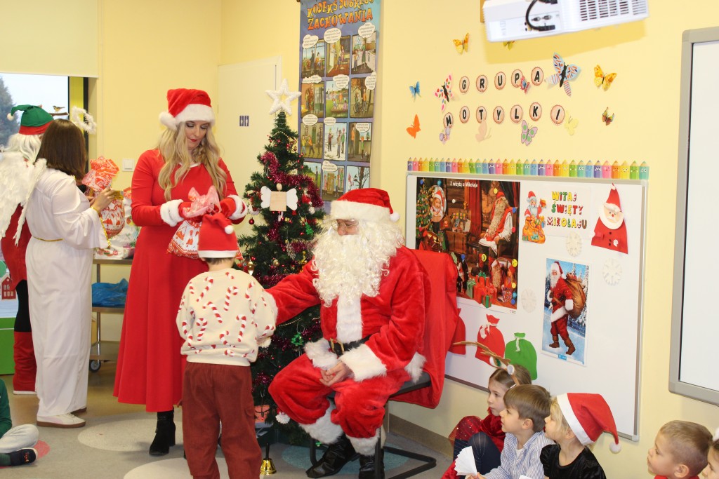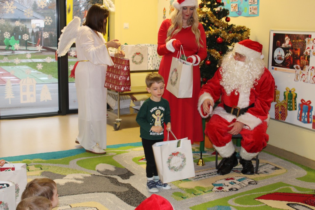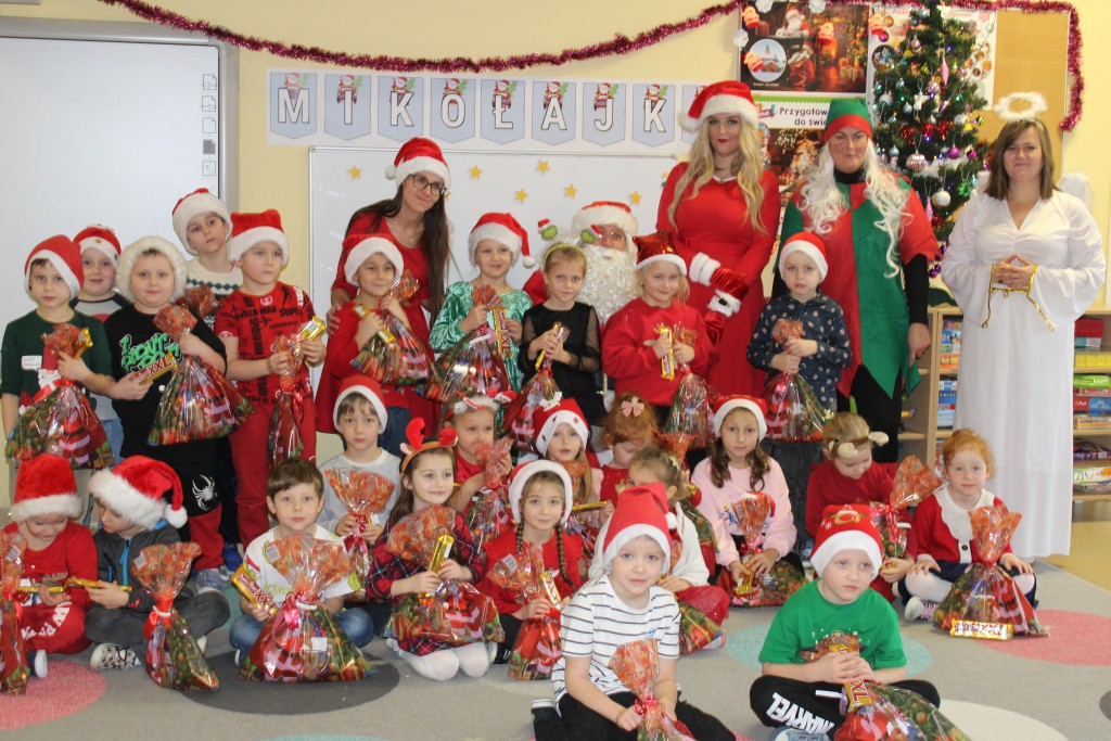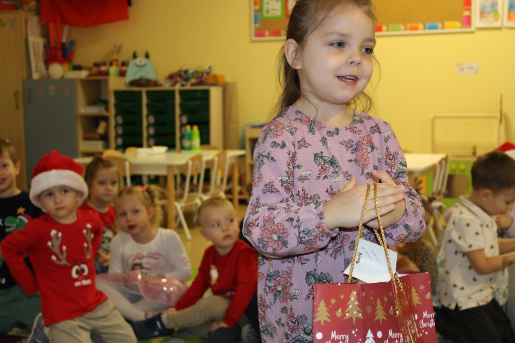 5 grudnia w naszym przedszkolu panowała wyjątkowa, pełna radości atmosfera. Już od rana dzieci z niecierpliwością nasłuchiwały dźwięku dzwoneczków, które mogły zwiastować nadejście długo wyczekiwanego gościa. Gdy wreszcie w drzwiach pojawił się Święty Mikołaj, w towarzystwie swoich pomocników, na twarzach przedszkolaków pojawiły się szerokie uśmiechy i iskierki zachwytu.Najbardziej wyczekiwanym momentem było oczywiście wręczanie prezentów. Każde dziecko zostało wywołane po imieniu i otrzymało paczkę od Świętego Mikołaja, który nie szczędził miłych słów, pochwał i zachęt do dalszego rozwijania swoich talentów. Pomocnicy czuwali nad tym, aby każdy otrzymał upominek i mógł zrobić sobie pamiątkowe zdjęcie z wyjątkowym gościem. Na zakończenie spotkania dzieci podziękowały Mikołajowi za wizytę, wręczając własnoręcznie przygotowane laurki. W przedszkolu jeszcze długo rozbrzmiewały świąteczne melodie.